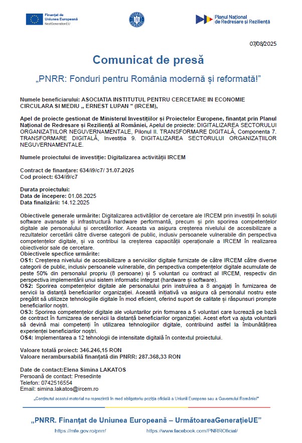 Proiectul de digitalizare al IRCEM este finanțat prin intermediul PNRR – Pilonul II „Transformare digitală”, Componenta 7, Investiția 9 „Digitalizarea sectorului ONG”, urmărește creșterea capacității digitale instituționale prin modernizarea infrastructurii IT, adoptarea de soluții software colaborative și consolidarea guvernanței datelor. Finalitatea este eficientizarea proceselor de cercetare și administrare și extinderea accesului public la rezultate, cu accent pe incluziune digitală.